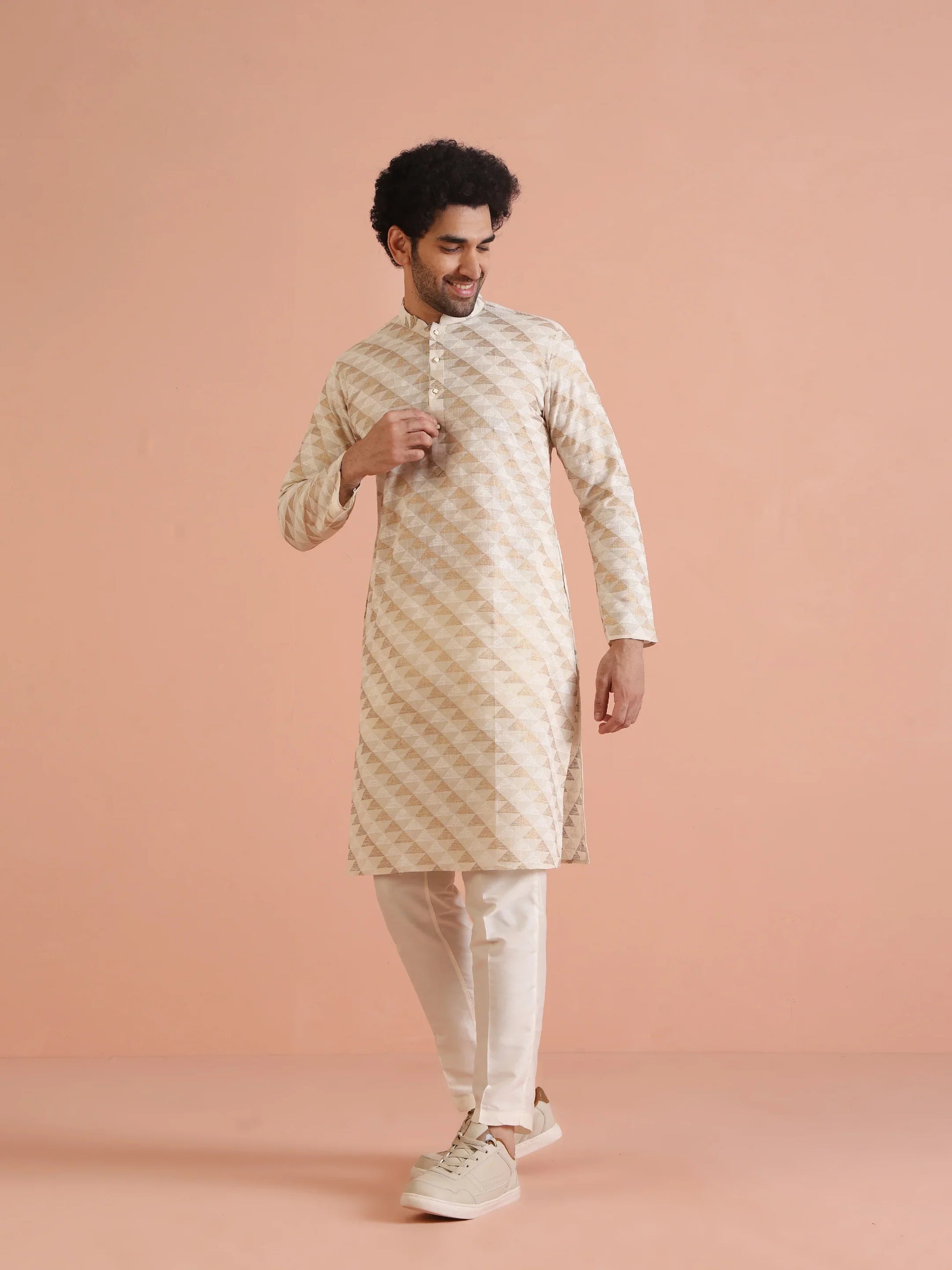 Men Cream Foil Print Kurta