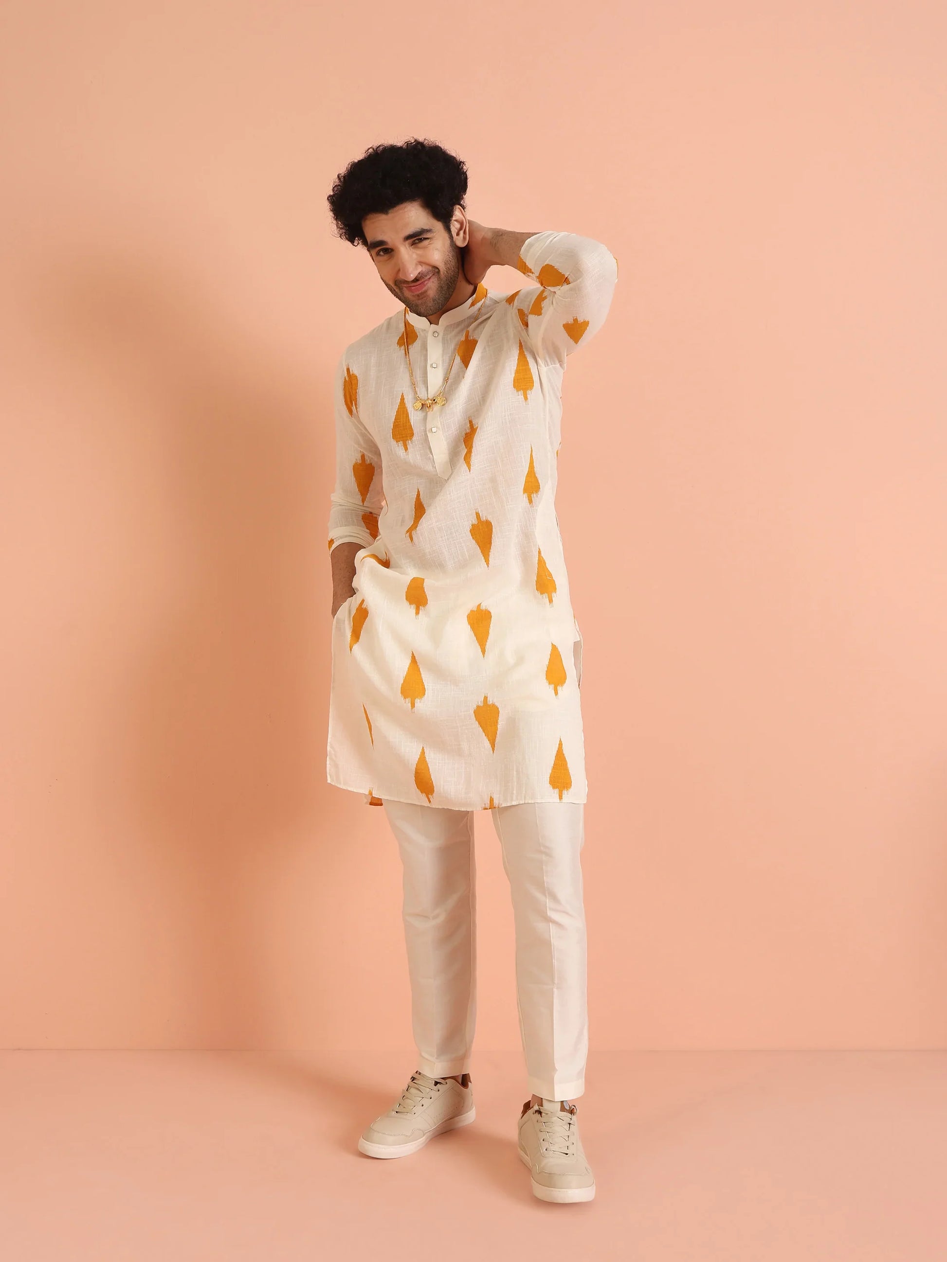 Men Yellow White Printed Haldi Kurta